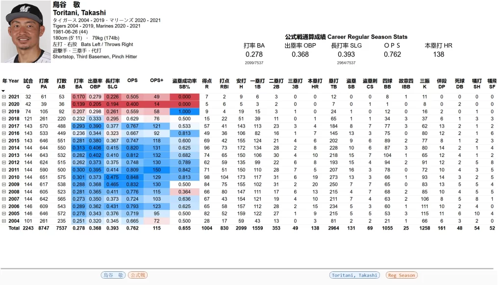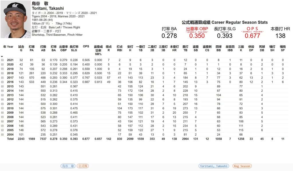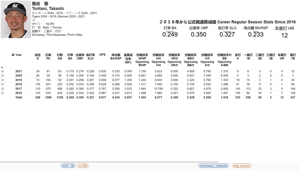 Below are the player lookup reports at the three levels of granularity for the now retired Toritani Takashi.
