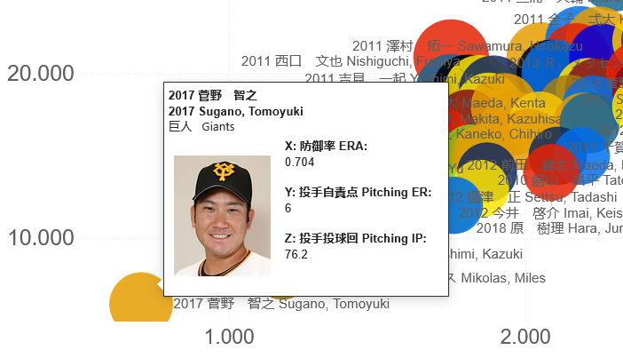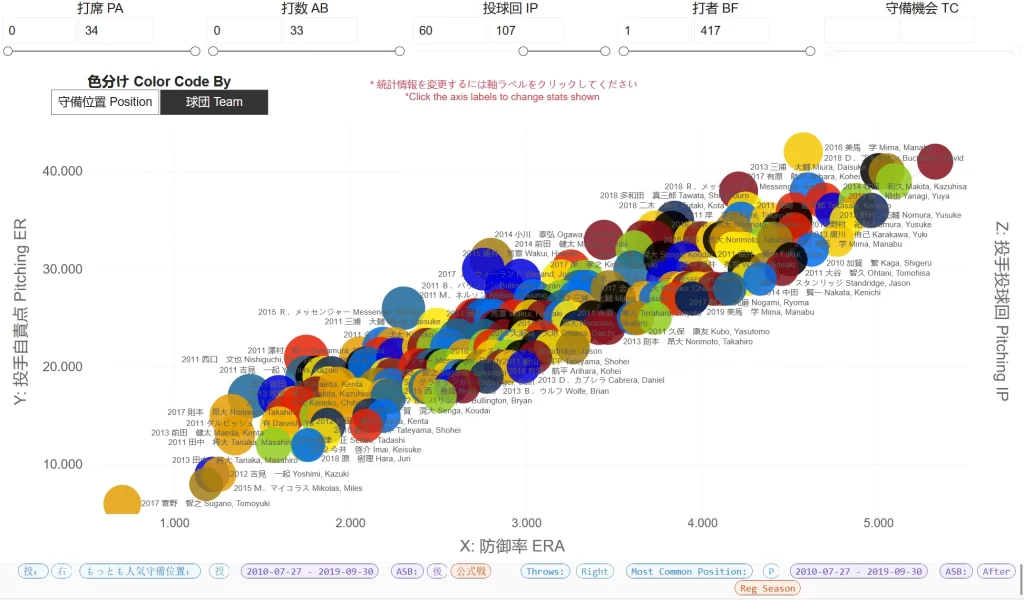 The below plots all right-handed pitchers from the 2010s post-All Star Break by ERA, Earned Runs, and sized by the number of innings. Also note at the top that we’ve applied a filter specific to the chart to only show pitchers who pitched minimum 60 innings post-All Star Break.