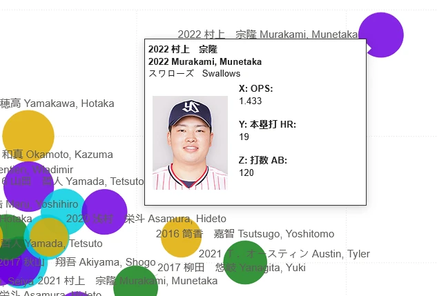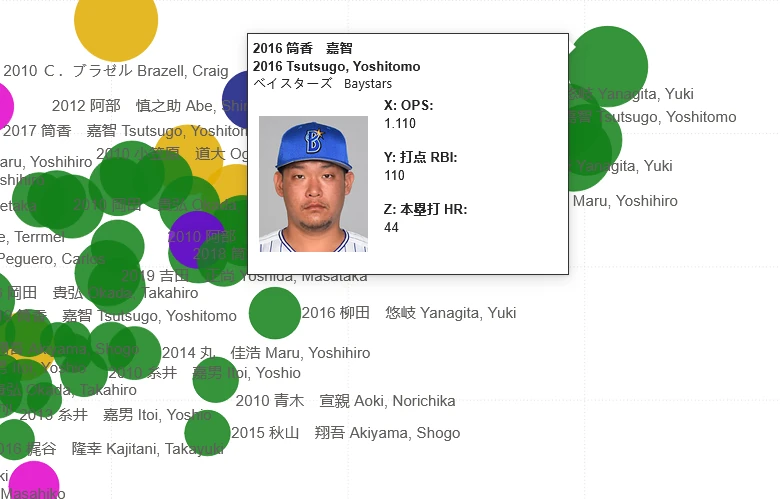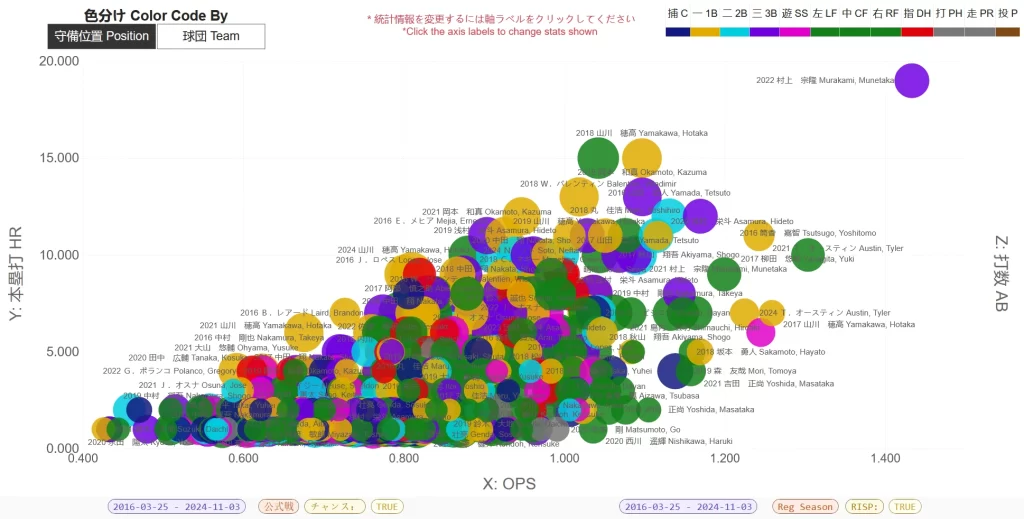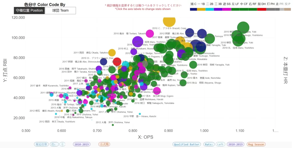 Looking at the bottom-right you can see how we’re breaking out, or filtering, the data. We’re looking at the regular season at all qualified, left-handed batters from the 2010s. We’re then charting them by OPS and RBI (sizing by Home Runs) to see what players had the best seasons.